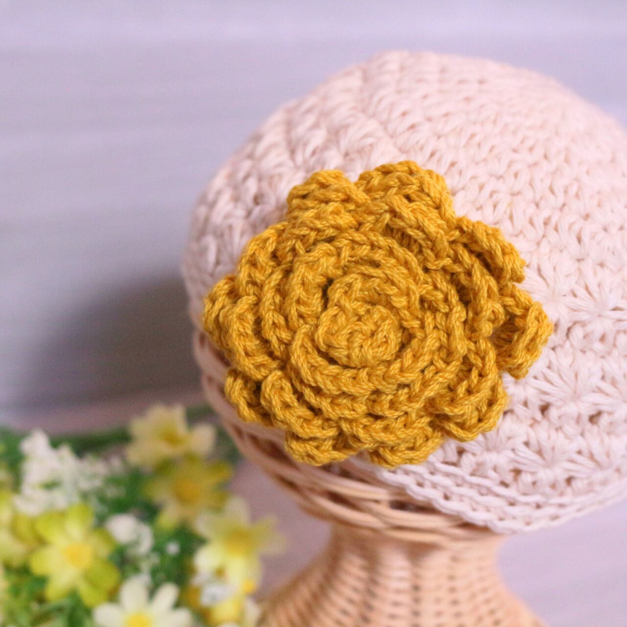 可愛らしい立体的なフラワーモチーフがついた手編みのニット帽。