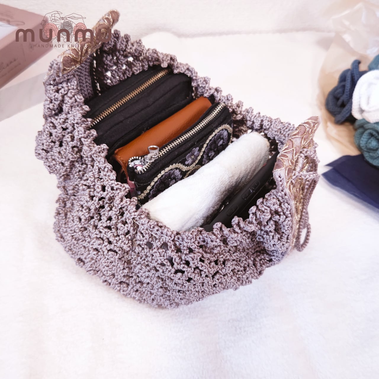 上品な光沢のあるグレージュの糸を使用し、巾着バッグを編みました。